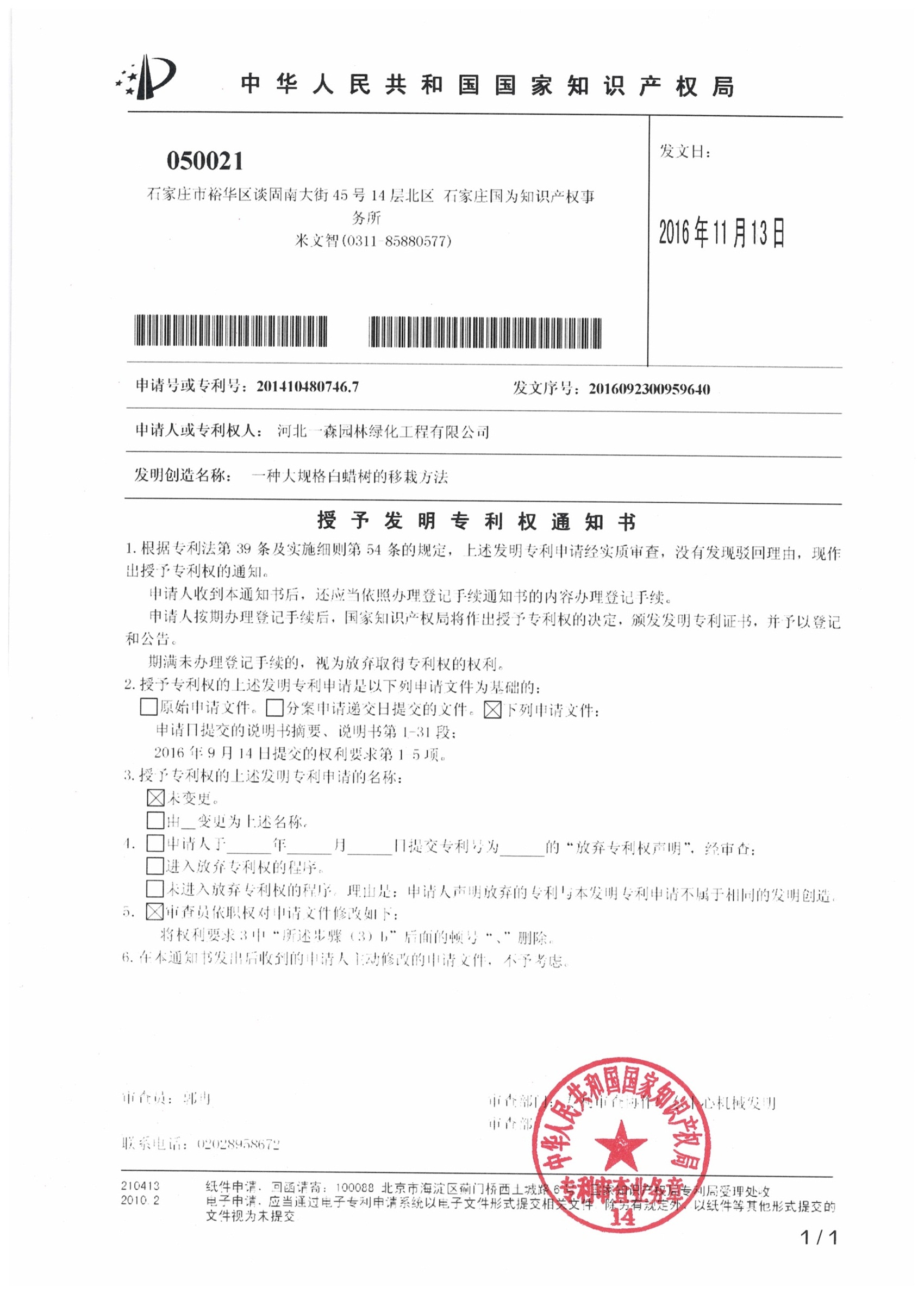 2016年11月13日,河北一森園林綠化工程股份有限公司收到國家知識產(chǎn)權(quán)局關(guān)于一森園林“一種大規(guī)格白蠟樹的移栽方法”被授予發(fā)明專利的通知,專利號201410480746.7。本發(fā)明專利涉及樹木的移栽技術(shù)領(lǐng)域,移栽成活率高,投資少,簡單易行,效果好,效益高。在園林綠化工程中作用突出,好掌控,效果顯著。河北一森園林已建成全國最大的大規(guī)格白蠟基地,在本發(fā)明專利方法的指導(dǎo)下,大規(guī)格白蠟的移栽成活率高達(dá)95%。