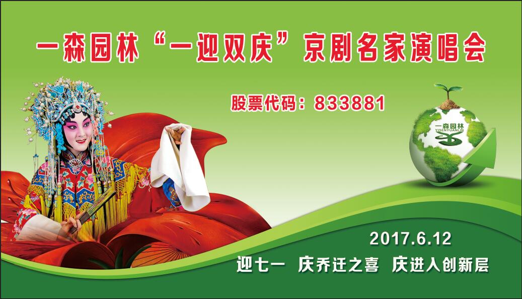 一森園林“一迎雙慶”京劇名家演唱會將于今晚8點在元龍國際酒店隆重舉行,屆時京劇梅花獎得主趙玉華領(lǐng)銜主演。“一迎”即迎“七一”,“雙慶”一慶一森園林登錄新三板創(chuàng)新層,二慶一森園林喬遷之喜,一森園林公司地址由河北省石家莊市元氏縣常山路131號京東大廈遷至河北省石家莊市元氏縣常山路180號元龍國際酒店6樓。